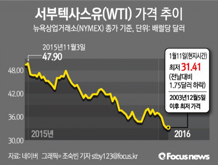 (서울=포커스뉴스) 11일(현지시간) 뉴욕상업거래소(NYMEX)에서 2월 인도분 서부텍사스산 원유(WTI)는 전날대비 1.75달러(5.3%) 떨어진 배럴당 31.41달러로 2003년 12월 이후 최저치를 기록했다.