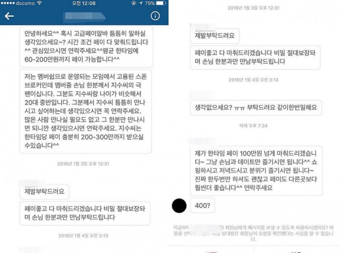 해당 메시지를 보낸 사람은 자신을 ‘멤버쉽으로 운영되는 모임에서 고용된 스폰서 브로커’라고 소개하며 “지수씨의 극성팬인 손님 한 사람이 지수씨를 틈틈이 만나고 싶어한다”고 말했다.