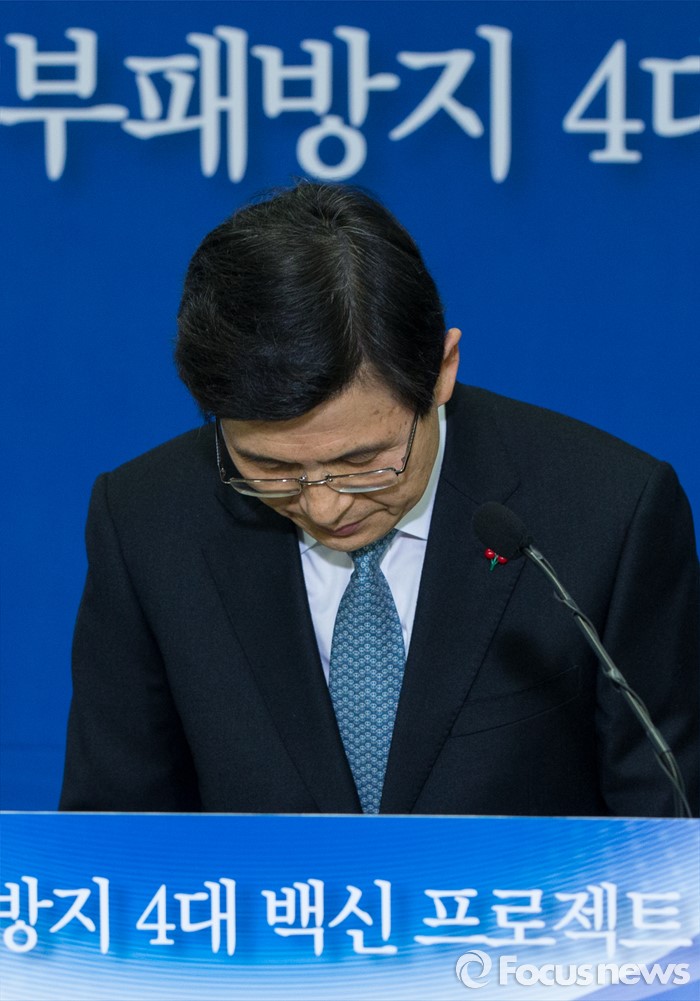 (서울=포커스뉴스) 12일 오전 서울 종로구 정부서울청사에서 황교안 국무총리가 부패방지 4대 백신 프로젝트를 발표 후 인사하고 있다. 정부는 이날 발표를 통해 실시간 감시, 리스크 관리, 정보상시 공유ㆍ연계, 내부클린시스템의 4대 백신 프로젝트를 2016년 부터 16개 분야, 240조원 운용 규모의 공공시스템에 본격 가동한다고 밝혔다.