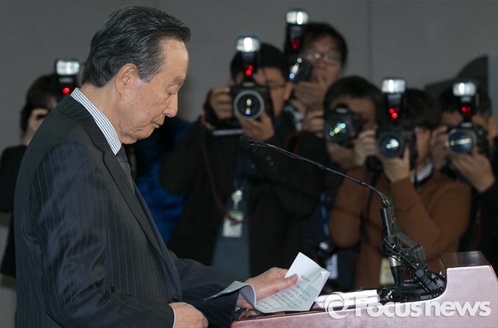 (서울=포커스뉴스) 권노갑 더불어민주당 상임고문이 12일 오전 서울 여의도 국회 정론관에서 탈당 기자회견을 하고 있다.