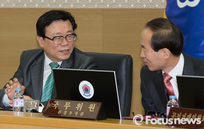(세종=포커스뉴스) 12일 오전 세종시 정부세종청사 국무회의장에서 열린 서울-세종 영상 국무회의에 참석한 이동필 농림축산식품부장관이 윤성규 환경부 장관과 대화하고 있다.