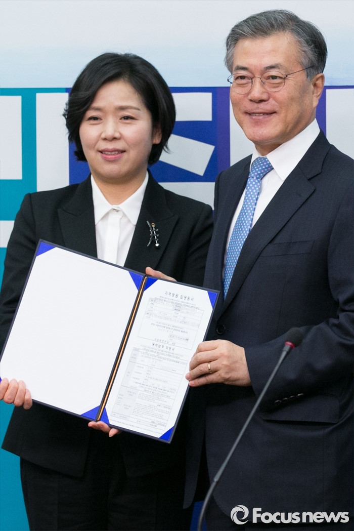(서울=포커스뉴스) 양향자(왼쪽) 전 삼성전자 상무가 12일 오전 서울 여의도 국회 더불어민주당 당대표실에서 입당 기자회견을 마치고 문재인 대표와 기념사진을 찍고 있다. 양 전 상무는 삼성전자 최초의 고졸여성 임원으로 삼성전자 메모리사업부 플래시 개발실 상무를 역임했다.