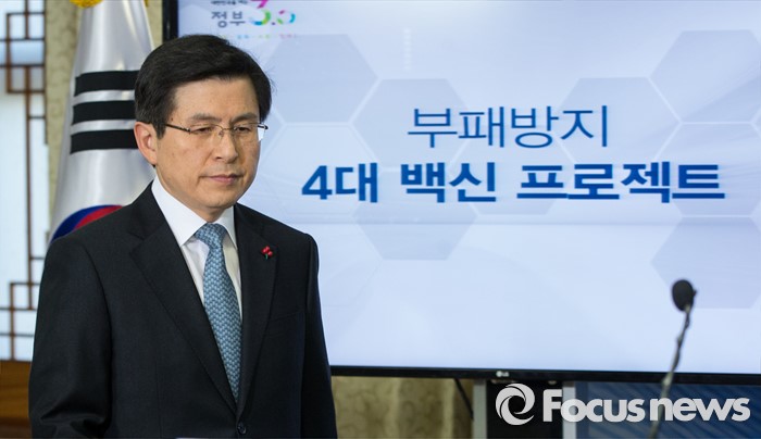 (서울=포커스뉴스) 12일 오전 서울 종로구 정부서울청사에서 황교안 국무총리가 부패방지 4대 백신 프로젝트를 발표를 위해 발걸음을 옮기고 있다. 정부는 이날 발표를 통해 실시간 감시, 리스크 관리, 정보상시 공유ㆍ연계, 내부클린시스템의 4대 백신 프로젝트를 2016년 부터 16개 분야, 240조원 운용 규모의 공공시스템에 본격 가동한다고 밝혔다.