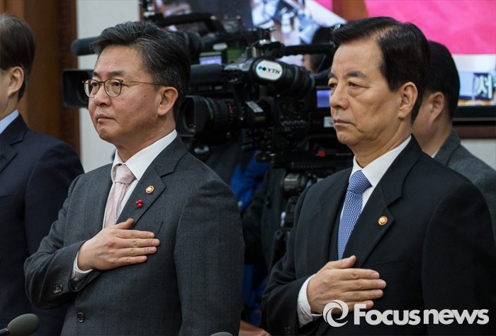 (서울=포커스뉴스) 12일 오전 서울 종로구 정부서울청사에서 열린 국무회의에 참석한 홍용표(왼쪽) 통일부 장관, 한민구 국방부 장관이 국민의례를 하고 있다.