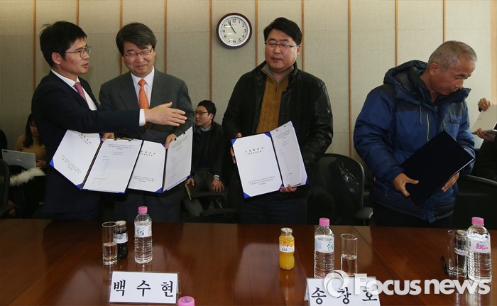 (서울=포커스뉴스) 12일 오전 서울 서대문구 충정로 법무법인 지평 회의실에서 열린 '삼성전자 반도체 등 사업장에서의 백혈병 등 질환 발병과 관련한 문제 해결을 위한 조정위원회'에서 조정 주체 교섭단 대표자들이 최종 합의서에 서명한 뒤 악수를 하던중 백수현 삼성전자 전무가 황상기 반올림 대표에게 악수를 권하다가 거절당하고 있다.