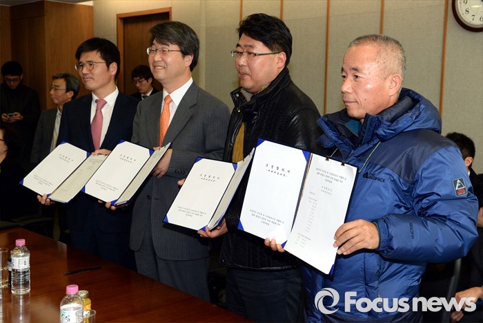 (서울=포커스뉴스) 삼성전자 반도체 사업장 백혈병 등 직업병 문제와 관련해 삼성전자와 가족대책위원회(가대위), 반올림(반도체노동자의 건강과 인권지킴이) 등 3개 교섭주체가 12일 오전 서울 서대문구 충정로 법무법인 지평에서 '재해예방대책'에 관한 최종 합의서에 서명한 뒤 들어보이고 있다.