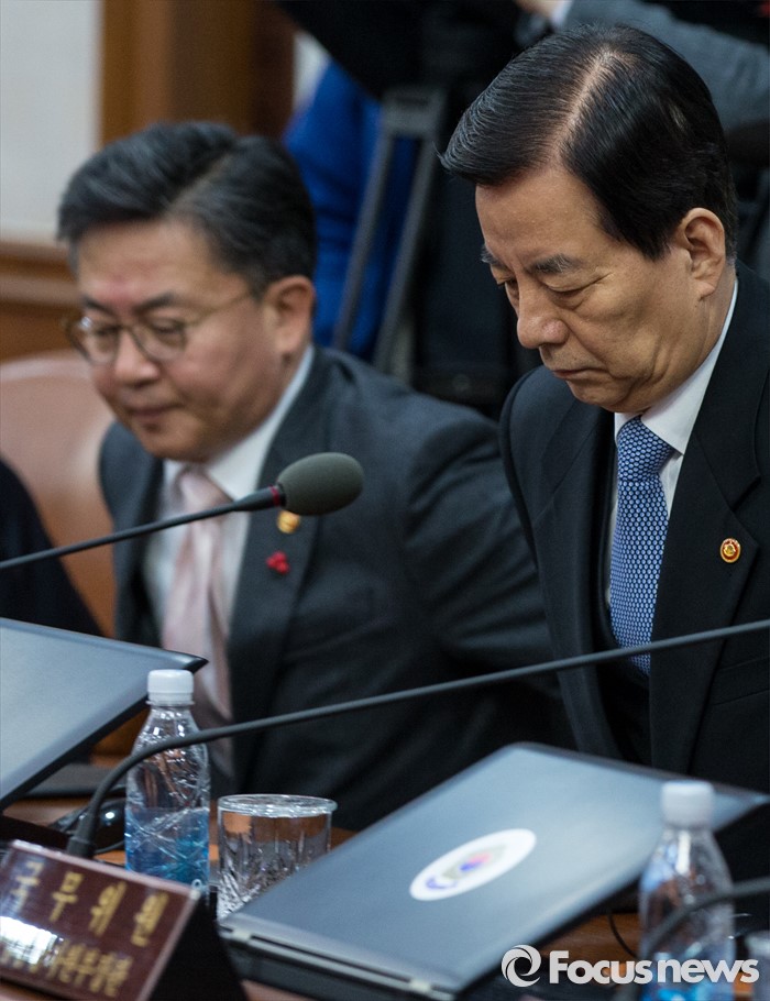 (서울=포커스뉴스) 12일 오전 서울 종로구 정부서울청사에서 열린 국무회의에 참석한 홍용표(왼쪽) 통일부 장관, 한민구 국방부 장관이 굳은 표정으로 착석하고 있다.