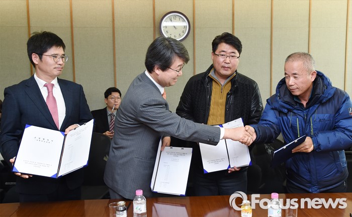 (서울=포커스뉴스) 12일 오전 서울 서대문구 충정로 법무법인 지평 회의실에서 열린 '삼성전자 반도체 등 사업장에서의 백혈병 등 질환 발병과 관련한 문제 해결을 위한 조정위원회'에서 조정 주체 교섭단 대표자들이 최종 합의서에 서명한 뒤 악수를 하고 있다.