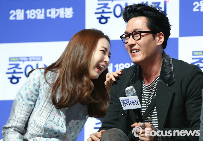 (서울=포커스뉴스) 12일 오전 서울 강남구 압구정 CGV에서 열린 영화 '좋아해줘' 제작보고회에 참석한 배우 최지우(왼쪽)와 김주혁이 환한 미소를 짓고 있다.
