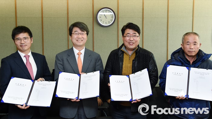 (서울=포커스뉴스) 12일 오전 서울 서대문구 충정로 법무법인 지평 회의실에서 열린 '삼성전자 반도체 등 사업장에서의 백혈병 등 질환 발병과 관련한 문제 해결을 위한 조정위원회'에서 조정 주체 교섭단 대표자들이 최종 합의서에 서명한 뒤 합의서를 들어보이고 있다.