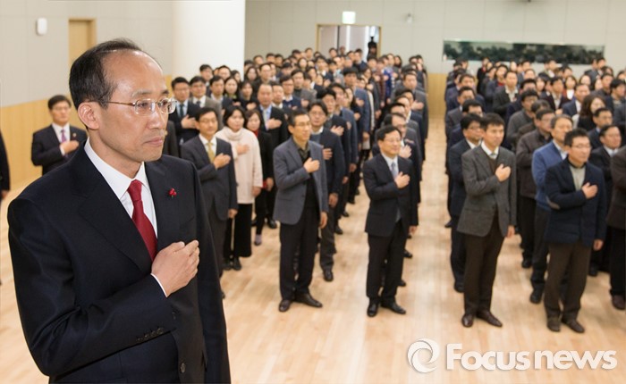 (세종=포커스뉴스) 추경호 국무조정실장이 12일 오후 세종시 정부세종청사 1동 대강당에서 열린 이임식에서 국기에 대한 경례를 하고 있다.