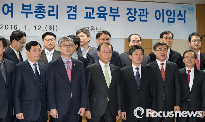 (세종=포커스뉴스) 황우여 사회부총리 겸 교육부장관이 12일 오후 세종시 정부세종청사 교육부 대회의실에서 열린 이임식에서 직원들과 기념촬영 하고 있다.