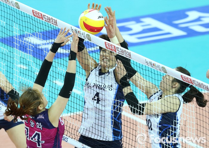 (인천=포커스뉴스) 12일 인천 계양체육관에서 열린 '2015-2016NH농협 V-리그' 여자부 흥국생명-IBK기업은행 경기에서 흥국생명 조송화와 IBK기업은행 김희진(4), 박정아가 네트에 떨어지는 볼을 서로 밀어 넣고 있다.
