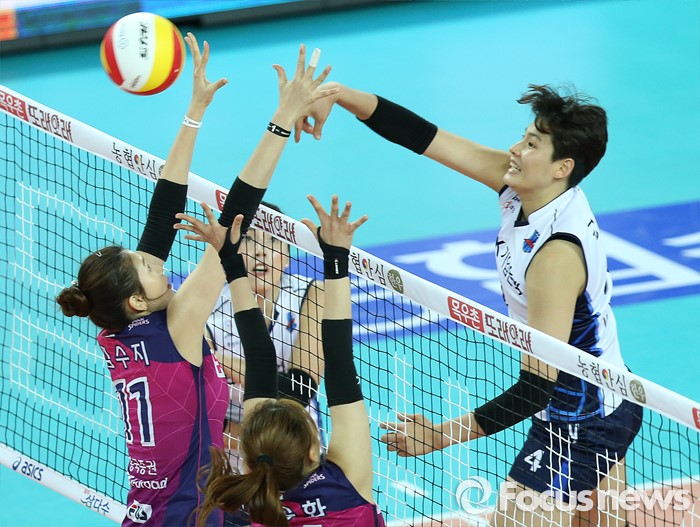 (인천=포커스뉴스) 12일 인천 계양체육관에서 열린 '2015-2016NH농협 V-리그' 여자부 흥국생명-IBK기업은행 경기에서 IBK기업은행 김희진(4)이 흥국생명 김수지(11), 조송화의 블로킹 위로 스파이크를 하고 있다.