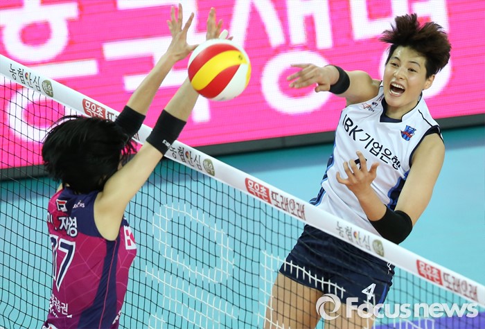 (인천=포커스뉴스) 12일 인천 계양체육관에서 열린 '2015-2016NH농협 V-리그' 여자부 흥국생명-IBK기업은행 경기에서 IBK기업은행 김희진(4)이 흥국생명 이재영의 블로킹 위로 강스파이크를 날리고 있다.