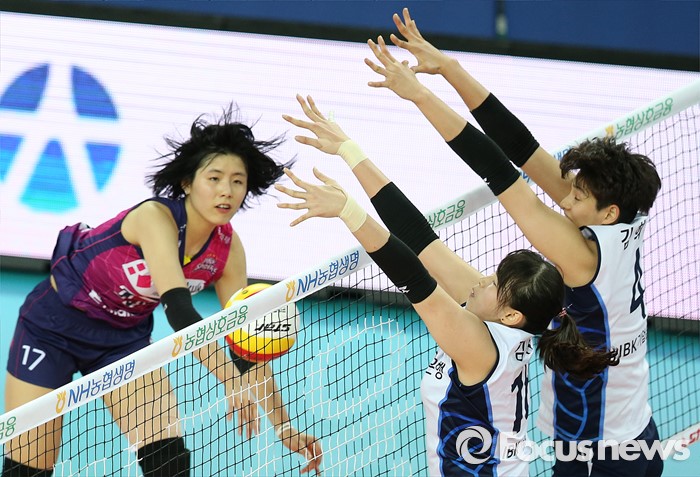 (인천=포커스뉴스) 12일 인천 계양체육관에서 열린 '2015-2016NH농협 V-리그' 여자부 흥국생명-IBK기업은행 경기에서 IBK기업은행 김희진(4), 김유리가 흥국생명 이재영의 스파이크를 블로킹으로 넘기고 있다.