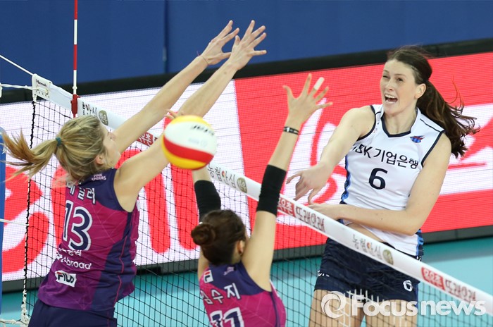 (인천=포커스뉴스) 12일 인천 계양체육관에서 열린 '2015-2016NH농협 V-리그' 여자부 흥국생명-IBK기업은행 경기에서 IBK기업은행 맥마흔이 흥국생명 테일러, 김수지의 블로킹 위로 오른손 강스파이크를 날리고 있다.