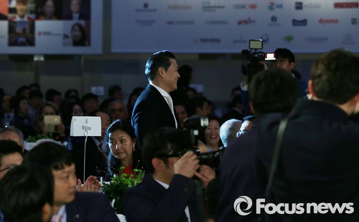 (서울=포커스뉴스) 12일 오후 서울 강남구 그랜드 인터컨티넨탈 호텔에서 한국이미지커뮤니케이션연구원(CICI) 주최로 열린 '12회 한국이미지상 시상식'에 참석한 가수 싸이가 한국 이미지 디딤돌상을 수상하기 위해 단상을 향해 이동하고 있다.