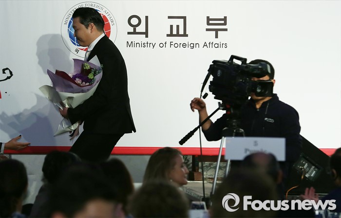 (서울=포커스뉴스) 12일 오후 서울 강남구 그랜드 인터컨티넨탈 호텔에서 한국이미지커뮤니케이션연구원(CICI) 주최로 열린 '12회 한국이미지상 시상식'에 한국 이미지 디딤돌상을 수상한 싸이가 단상을 내려오고 있다.
