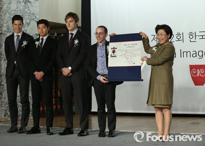 (서울=포커스뉴스) 12일 오후 서울 강남구 그랜드 인터컨티넨탈 호텔에서 한국이미지커뮤니케이션연구원(CICI) 주최로 열린 '12회 한국이미지상 시상식'에 참석한 JTBC예능 프로그램 '비정상 회담'의 패널 알베르토 몬디(왼쪽부터), 장위안, 기욤 패트리, 타일러 라쉬와 최정화 CICI 대표가 포즈를 취하고 있다.