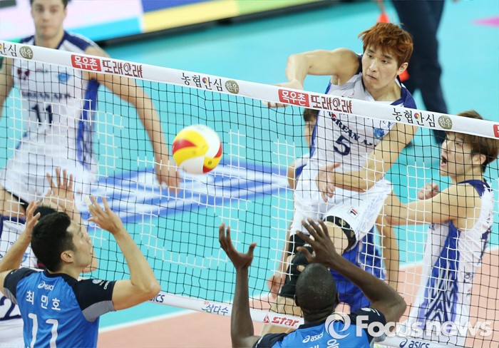 (인천=포커스뉴스) 12일 인천 계양체육관에서 열린 '2015-2016NH농협 V-리그' 남자부 대한항공-현대캐피탈 경기에서 대한항공 최석기(5)가 속공으로 현대캐피탈의 블로킹을 따돌리며 공격하고 있다.