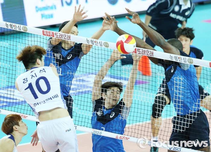 (인천=포커스뉴스) 12일 인천 계양체육관에서 열린 '2015-2016NH농협 V-리그' 남자부 대한항공-현대캐피탈 경기에서 현대캐피탈 최민호, 오레올이 블로킹으로 대한항공 정지석의 공격을 막고 있다.