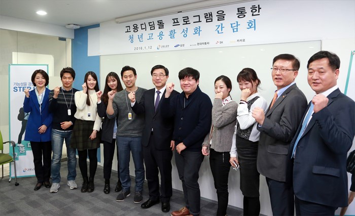 (서울=포커스뉴스) 이기권 고용노동부장관이 12일 오후 경기 성남시 분당구 삼평동 카카오 판교오피스에서 열린 고용디딤돌 간담회에 참석, 고용디딤돌 프로그램 참여기업 관계자 및 참여청년들과 간담회를 갖고 기념촬영하고 있다. <사진제공=고용노동부>