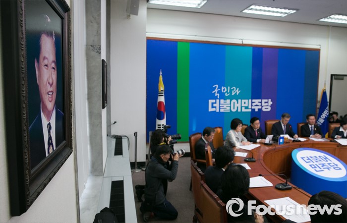 (서울=포커스뉴스) 13일 오전 서울 여의도 국회에서 열린 더불어민주당 최고위원회의장에 故 김대중 전 대통령 사진이 걸려 있다.