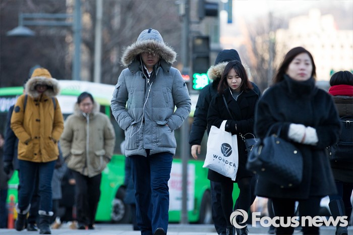 (서울=포커스뉴스) 계속되는 맹추위로 전국이 꽁꽁 얼어붙은 13일 오전 서울 종로구 세종로 사거리에서 출근길 시민들이 중무장을 하고 걷고 있다. 현재 서울 기온은 영하 9도를 기록하고 있으며 충남과 호남 서해안 지역에는 대설주의보가 내려졌다.