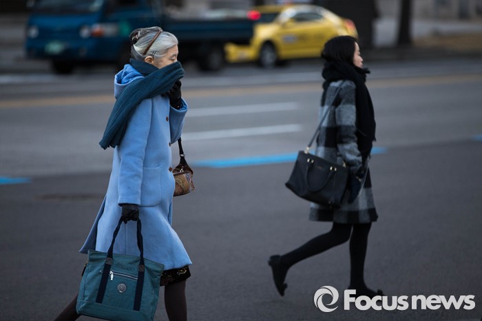 (서울=포커스뉴스) 계속되는 맹추위로 전국이 꽁꽁 얼어붙은 13일 오전 서울 종로구 세종로 사거리에서 출근길 시민들이 중무장을 하고 걷고 있다. 현재 서울 기온은 영하 9도를 기록하고 있으며 충남과 호남 서해안 지역에는 대설주의보가 내려졌다.