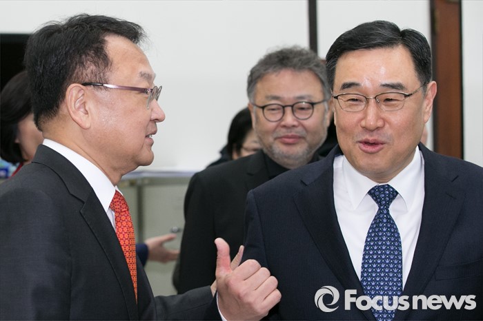 (서울=포커스뉴스) 취임식을 앞둔 유일호(왼쪽) 신임 경제부총리 겸 기획재정부 장관이 13일 오전 서울 여의도 국회 새누리당 대표최고위원실에서 김정훈(오른쪽) 정책위의장을 비롯한 여당 의원들과 인사하고 있다.