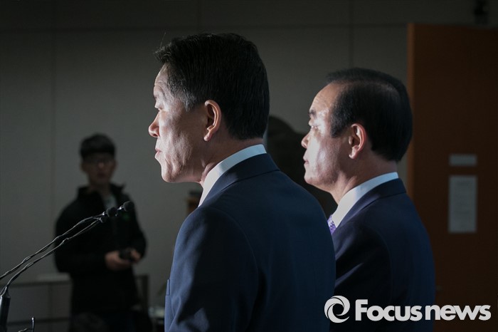 (서울=포커스뉴스) 더불어민주당 주승용(오른쪽), 장병완 의원이 13일 오전 서울 여의도 국회 정론관에서 탈당 표명 기자회견을 하고 있다.