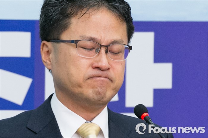 (서울=포커스뉴스) 재정부 국고국 과장을 역임한 국가재정 전문가 김정우 세종대 교수가 13일 오전 서울 여의도 국회 더불어민주당 대표회의실에서 입당 기자회견을 하며 눈물을 흘리고 있다. 김 교수의 부친은 김철배 더민주 강원도당 고문으로 12대 총선부터 15대 총선까지 5번(보선 1회 포함)을 철원, 화천, 양구 지역에서 범민주당의 이름으로 출마해, 5번 내리 낙선했다.