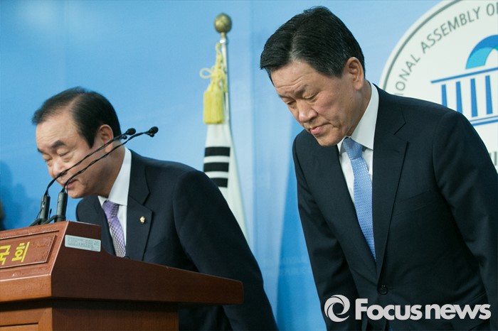 (서울=포커스뉴스) 더불어민주당 주승용(오른쪽), 장병완 의원이 13일 오전 서울 여의도 국회 정론관에서 탈당 표명 기자회견을 마치고 인사하고 있다.