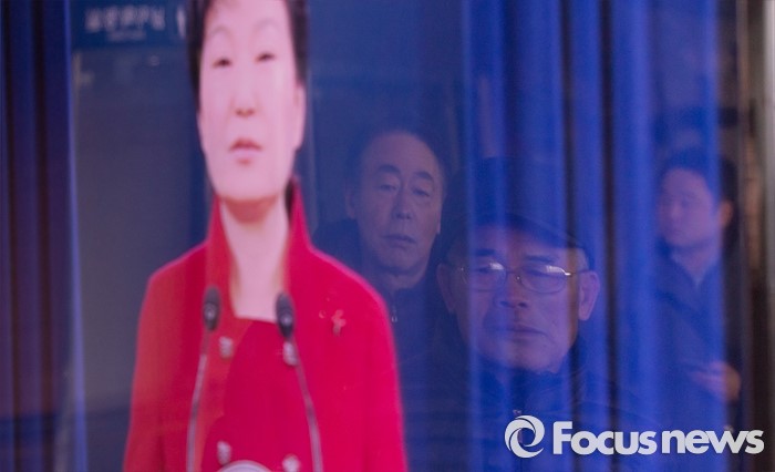 (서울=포커스뉴스) 13일 오전 서울역 대합실에서 시민들이 박근혜 대통령의 대국민 담화 및 기자회견을 시청하고 있다.