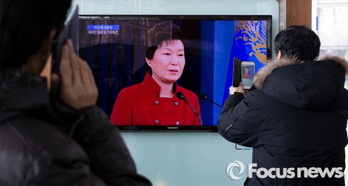 (서울=포커스뉴스) 13일 오전 서울역 대합실에서 시민들이 박근혜 대통령의 대국민 담화 및 기자회견을 시청하고 있다.