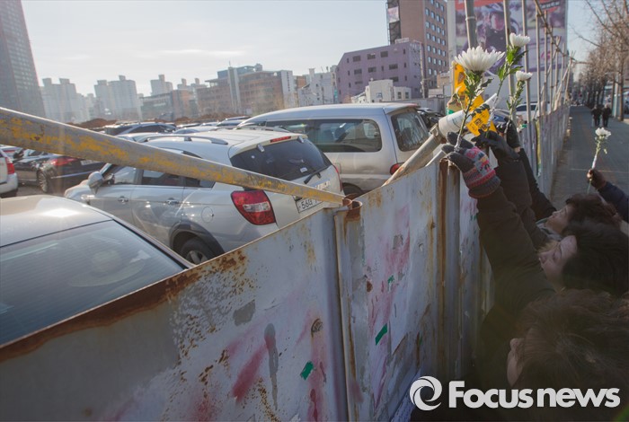 (서울=포커스뉴스) 13일 오전 서울 용산구 남일당 주차장에서 열린 '용산참사 7주기 추모주간 선포' 기자회견에 참석한 희생자의 유가족들이 옛 남일당터 울타리에 국화를 바치고 있다.
