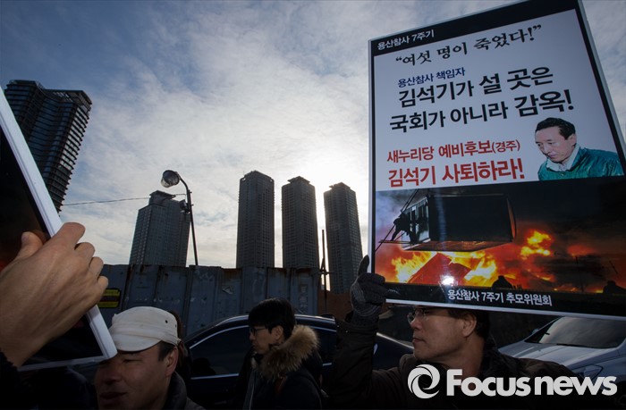 (서울=포커스뉴스) 13일 오전 서울 용산구 남일당 주차장에서 열린 '용산참사 7주기 추모주간 선포' 기자회견에 참석한 용산참사7주기 추모위원회원들이 김석기 의원의 사퇴를 요구하는 손팻말을 들고 있다.