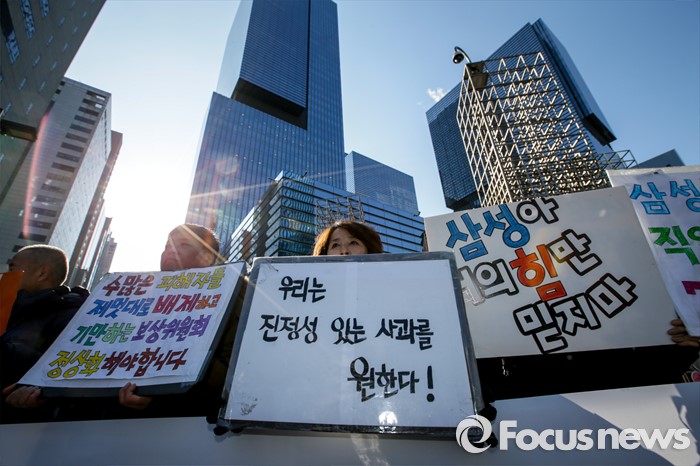 (서울=포커스뉴스) 13일 오전 서울 서초구 삼성전자 본관 앞에서, 반도체 노동자의 건강과 인권지킴이(반올림) 회원과 피해자 가족들이 전날 열린 조정위원회 합의 내용에 대한 입장을 밝히며 사과 및 보상 문제에 대한 조속한 해결을 촉구하고 있다.