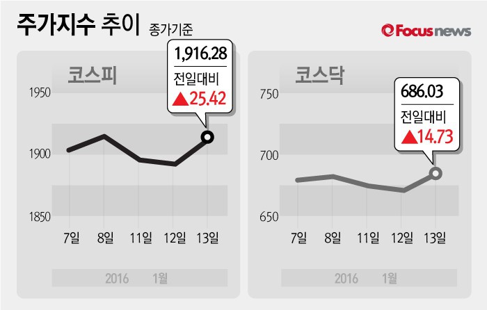 (서울=포커스뉴스) 12일 코스피지수는 전날 보다 1.34%(25.42포인트) 상승한 1916.28에 장을 마쳤다. 코스닥지수는 전일 대비 2.19%(14.73포인트) 오른 686.03에 마감했다.
