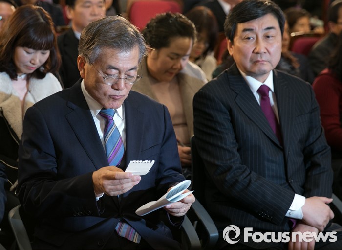 (서울=포커스뉴스) 13일 오후 서울 여의도 국회 의원회관에서 더불어민주당 누리과정특위 주최로 열린 임박한 보육대란, 어떻게 해결할 것인가 긴급 현안토론회에 참석한 문재인 대표가 메모를 보고 있다. 오른쪽은 이종걸 원내대표.