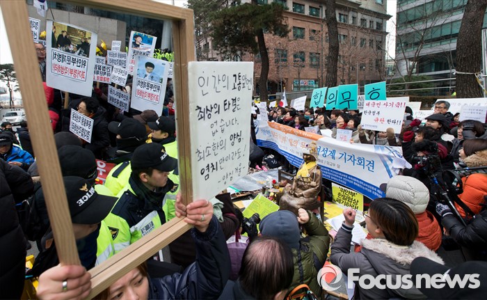 (서울=포커스뉴스) 13일 오후 서울 종로구 구 일본대사관 앞에서 한국여성단체연합이 한일 일본군 위안부 합의 규탄 기자회견을(오른쪽), 어버이연합이 한국정신대문제대책협의회(정대협)을 비난하는 기자회견을 하고 있다.