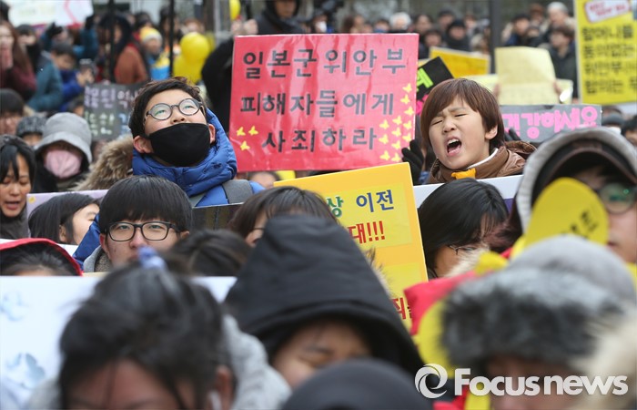 (서울=포커스뉴스) 13일 오후 서울 종로구 옛 일본대사관 앞에서 열린 제1213차 일본군 위안부 피해자 문제 해결 위한 정기 수요시위에서 참가자들이 일본정부의 공식 사과를 촉구 하고 있다.
