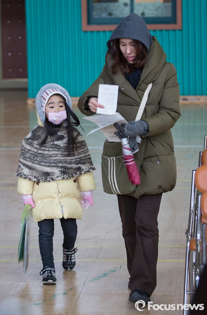 (서울=포커스뉴스) 13일 오후 서울 용산구 이태원초등학교에서 초등학교 신입생 예비소집 행사가 열려 학부모와 예비초등학생이 예비소집 장소로 걸어 오고 있다.