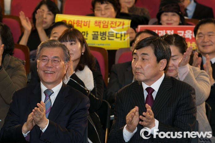 (서울=포커스뉴스) 13일 오후 서울 여의도 국회 의원회관에서 더불어민주당 누리과정특위 주최로 열린 임박한 보육대란, 어떻게 해결할 것인가 긴급 현안토론회에 참석한 문재인(왼쪽) 대표와 이종걸 원내대표가 박수치고 있다.