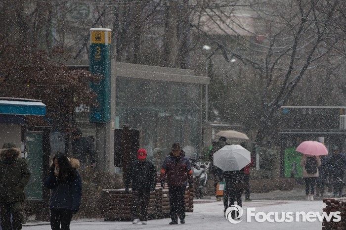 (서울=포커스뉴스) 서울을 포함한 중부지방에 많은 눈이 내린 13일 오후 서울 성북구 길음역 근처에서 시민들이 발걸음을 재촉하고 있다.