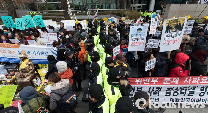 (서울=포커스뉴스) 13일 오후 서울 종로구 구 일본대사관 앞에서 한국여성단체연합이 한일 일본군 위안부 합의 규탄 기자회견을(왼쪽), 어버이연합이 한국정신대문제대책협의회(정대협)을 비난하는 기자회견을 하고 있다.
