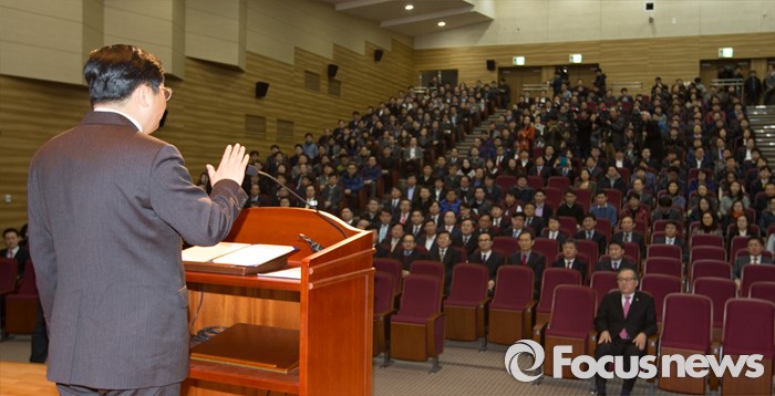 (세종=포커스뉴스) 주형환 신임 산업통상자원부장관이 13일 오후 세종시 정부세종청사 산업부 대강당에서 열린 취임식에 참석해 공무원선서를 하고 있다.