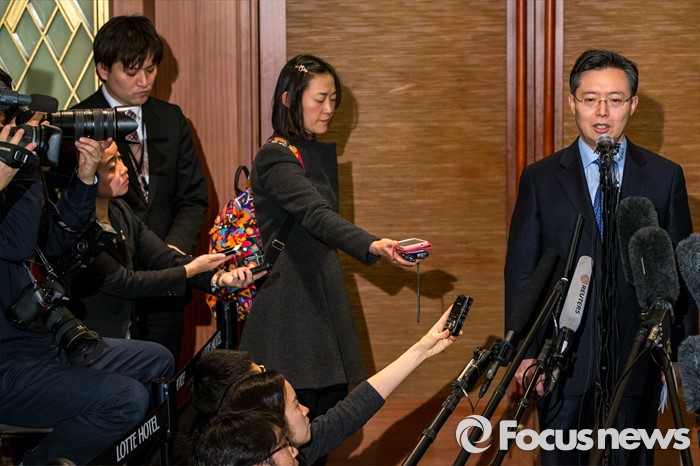 (서울=포커스뉴스) 황준국 외교부 한반도평화교섭본부장이 13일 오후 서울 중구 롯데호텔에서 열린 '한미일 6자회담 수석대표 긴급회동'에 자리해 북한 4차 핵실험 강행 관련 대북제재 방안 논의를 마친 뒤 입장발표를 하고 있다.