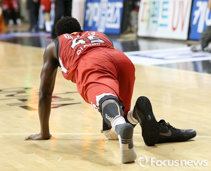 (안양=포커스뉴스) 13일 안양실내체육관에서 열린 2015-2016 프로농구 KGC-KCC 경기에서 KGC 마리오 리틀이 경기 도중 왼발에 쥐가나자 신발을 벗고 발바닥을 펴고 있다.